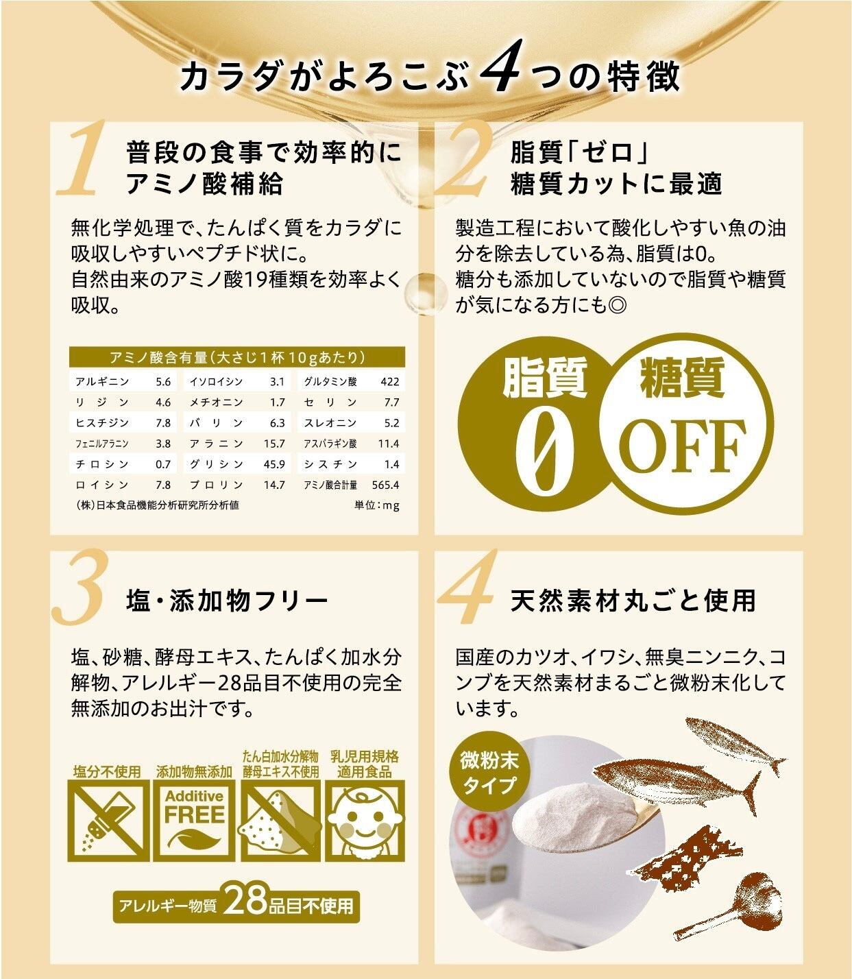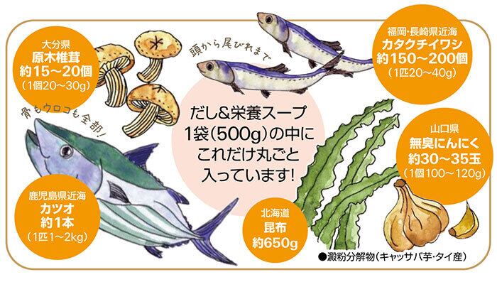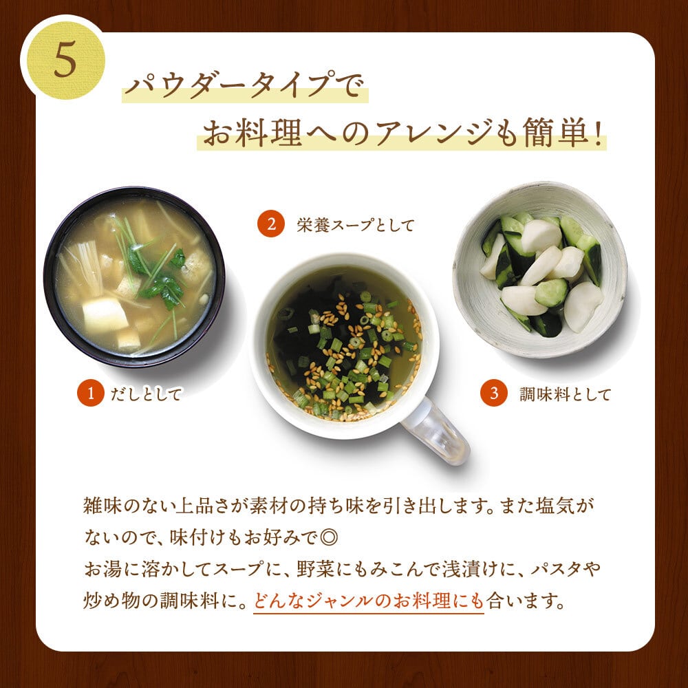 これひとつで、「だし」「調味料」「栄養スープ」の3役こなす便利な粉末だし。